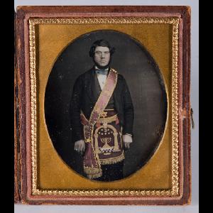 This daguerreotype shows a Royal Arch member wearing a colorful apron and sash. His boldly colored apron shows a design incorporating many emblems that Masons use to teach the lessons of the different degrees to candidates. Color also holds a symbolic place in Masonic ritual. Red, as exhibited in this man's embroidered velvet apron, is generally associated with the Royal Arch degrees. In these degrees the color red represents “ardor and zeal” as well as fire, “the symbol of the regeneration and purification of souls.” For further information, see Newell, Aimee E., “The Badge of a Freemason," 2015, p. 212.