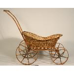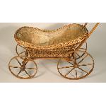 Wicker doll carriage has spoked wheels; cotton lining with lace edging; wood plank bottom.